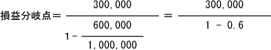 コレが損益分岐点の計算式です。いちいち前回のページに戻るのも面倒ですから、も一度掲載しました。 まず固定費。これは人件費(註1)やパソコンなどの設備投資(註2)、ADSLやFTTHなどの通信費、プロバイダ料金やレンタルサーバー料金、広告宣伝費など、一度発生すると売り上げに関係なく必要になる費用がコレに含まれます。 次に変動費。これには、商品・サービス・情報など、サイトで取り扱っている商品の仕入れ原価や、原材料費、外注費、運送料金など、売上高に比例して変動する費用が当てはまります。 では、1つの例をこの数式に当てはめてみましょう。まず、現在の売り上げを月額100万円、固定費を30万円、変動費を60万円と仮定します。広告宣伝費は無料の書き込み等を使用。有料広告は使用しないと仮定します。 で、当てはめてみたのが以下の数式です。